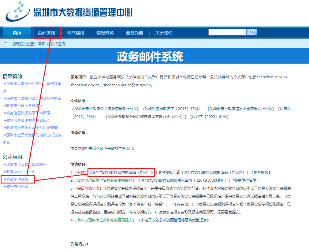 2.下载“政务邮件系统”内容页面中,申请材料第1项:《深圳市政务邮件系统申请表(外网)》。