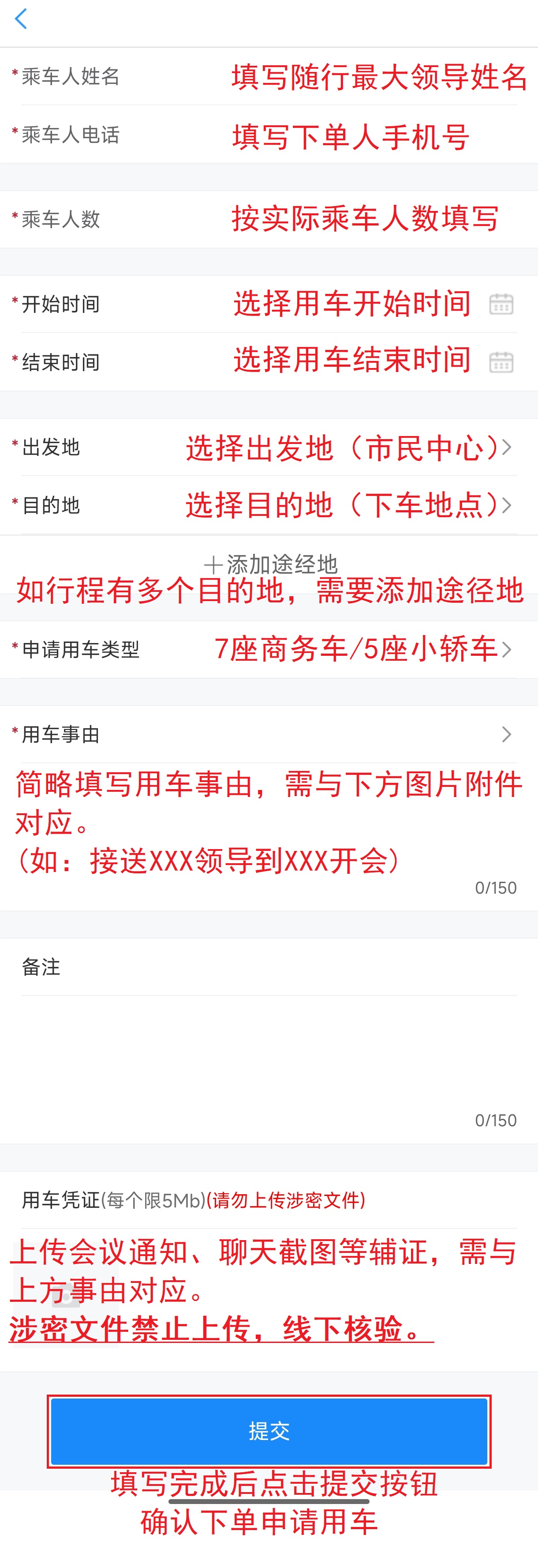 用车凭证:上传相关会议通知、聊天记录等作为辅证,严禁上传涉密信息,涉密信息线下核验。
