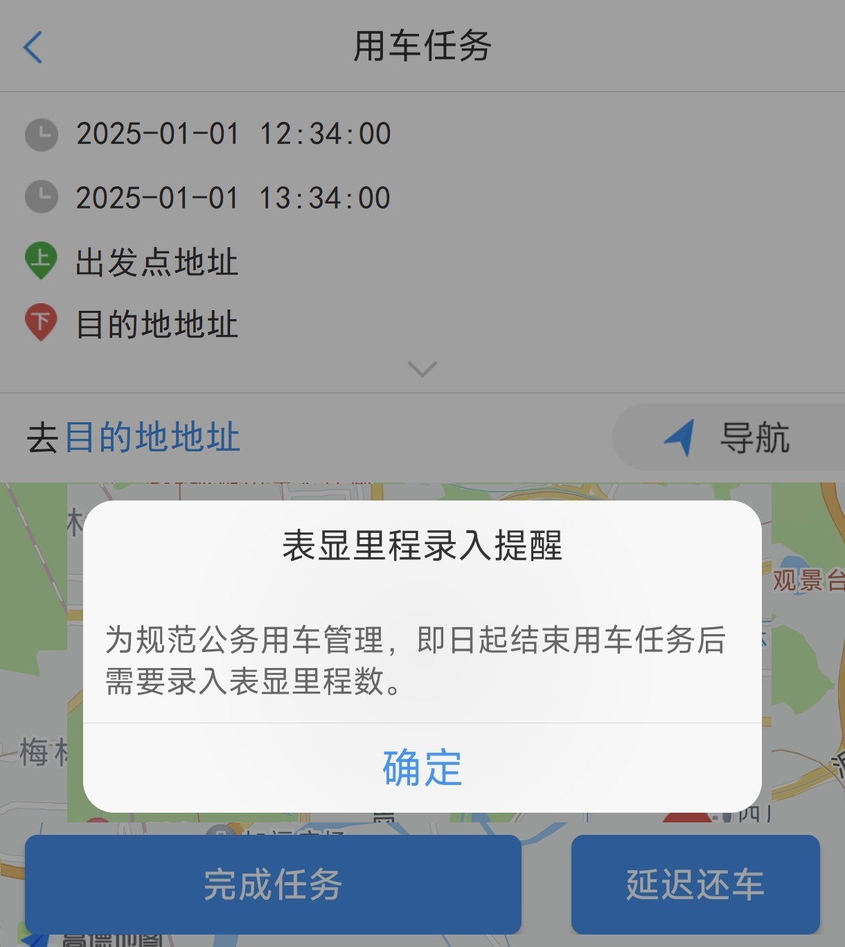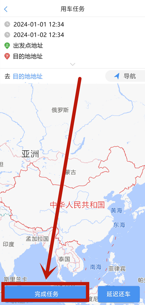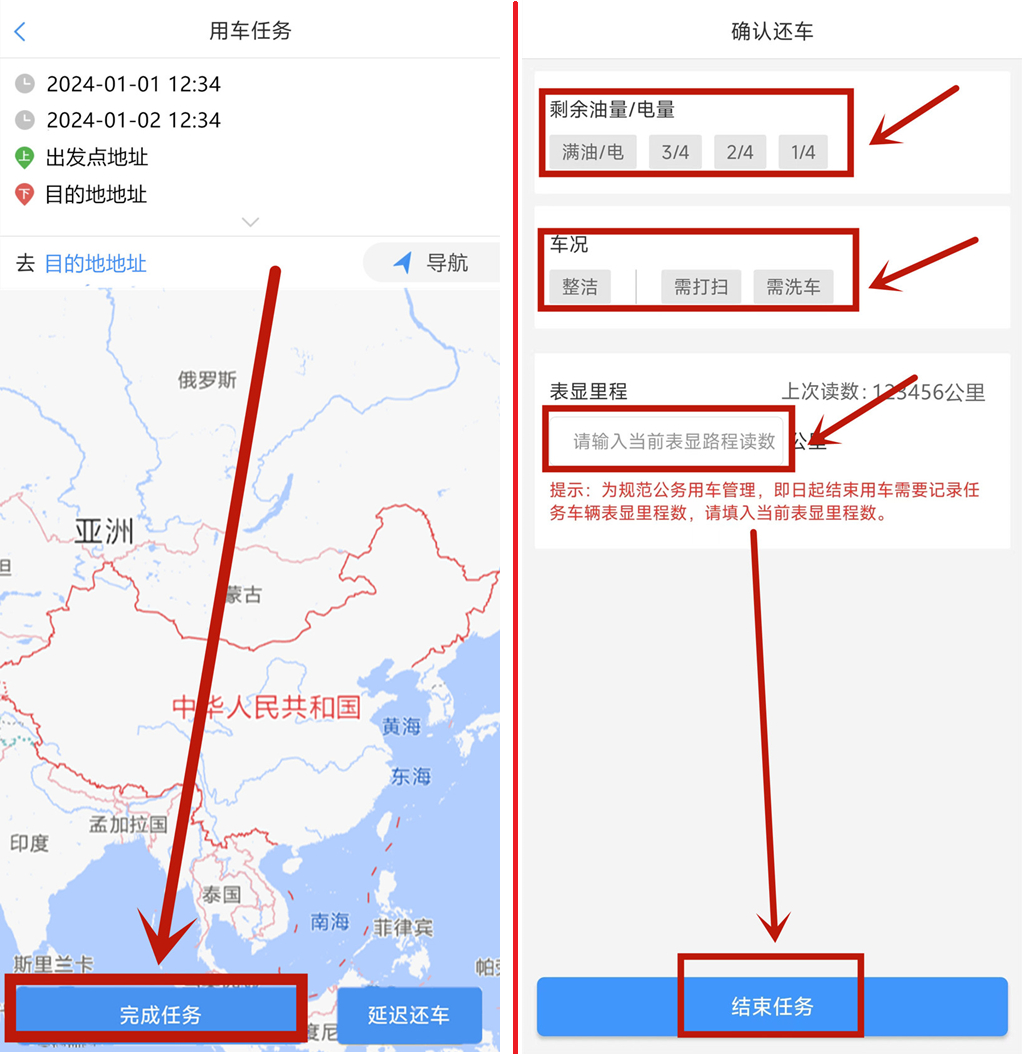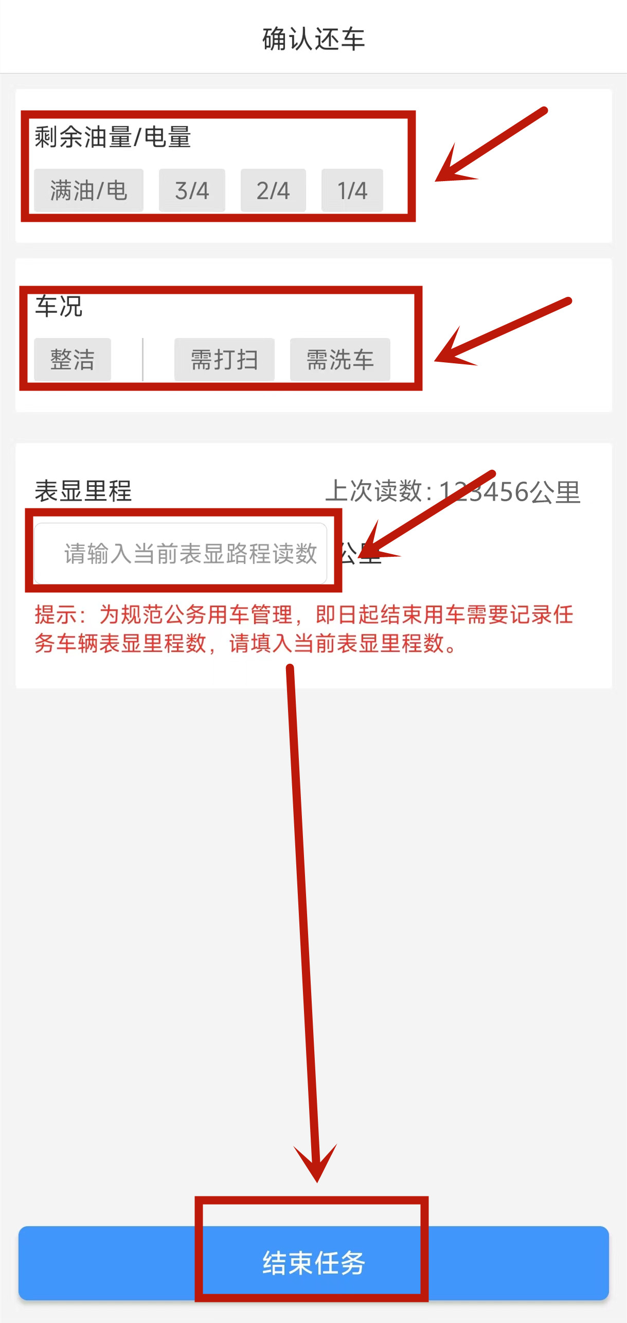 3.点击底部“完成任务”,并录入油量情况、车辆卫生情况、车辆里程数。