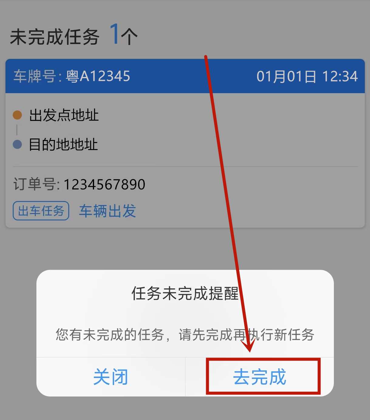 2.系统提示当前有未完成订单,点击“去完成”;